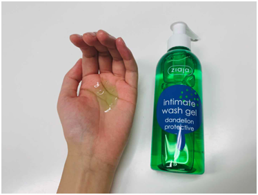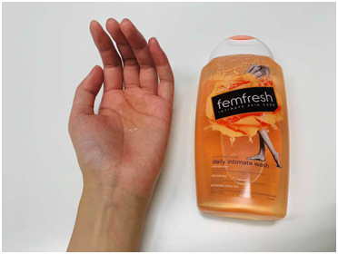 femfresh私处洗液倒出来,呈现的是透明啫喱液体,有点带黄色,黏性很足,散发出淡淡的洋甘菊香味。