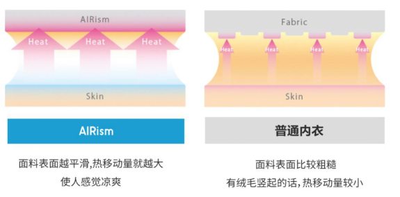 当皮肤接触内衣时,热量会立即从皮肤传递到布料织物上(注)。 织物越光滑,转移的热量越多,使人感觉凉爽。与之相反,衣物布料粗糙或有绒毛的话,转移的热量就比较少。AIRism正是因为使用这样的原理,追求柔滑。接触的瞬间就能感受到凉爽,缓解闷热不适。