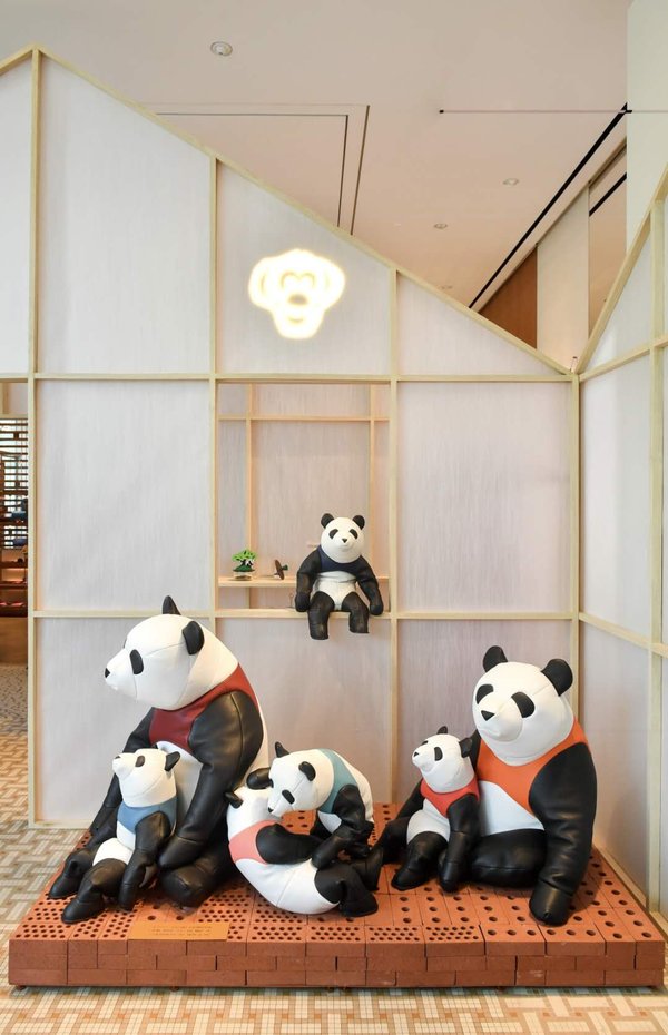 庞大而慵懒的大熊猫由皮革缝制而成,悠然地展示着胖乎乎的身体