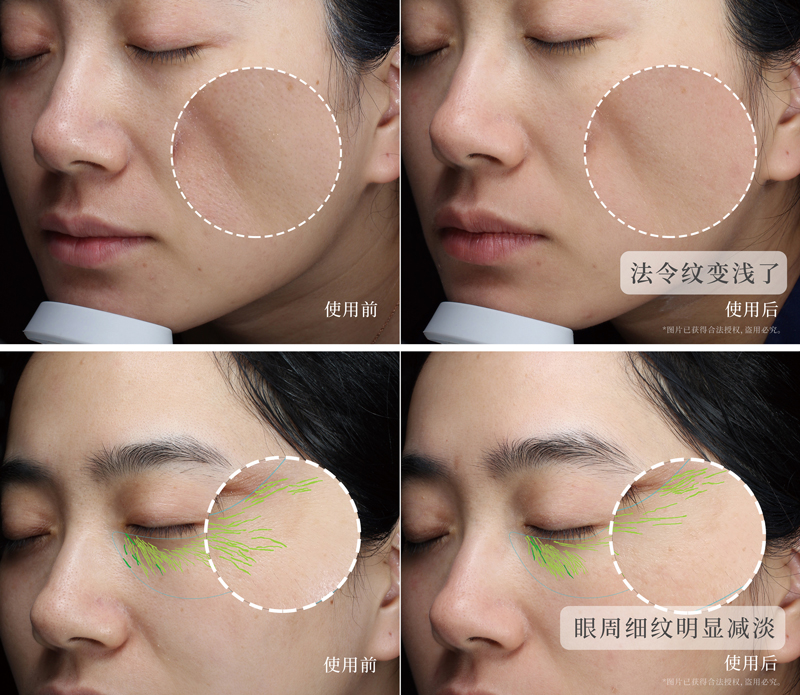 此外,雅萌还邀请了来自深圳德医医疗的秦晓蕾博士连续14天使用红光Bloom并输出肌肤变化观察报告,测试仪器来自VISIA皮肤检测仪,可见对于法令纹和眼周细纹的改善效果十分明显。