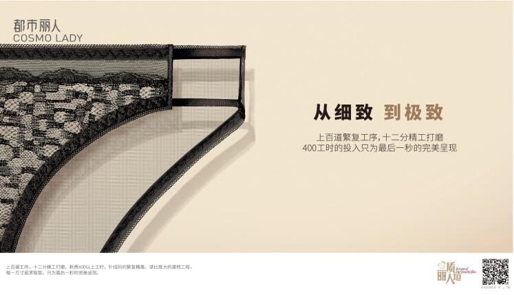 究毫厘逐千里、凭眼见致远见、从细致到极致、经曲折觅曲线,将都市丽人在20年的品质坚守专注中,从剪裁、设计到用料、做工,每一步都细腻到极致,用匠心品质,创造安心之美。