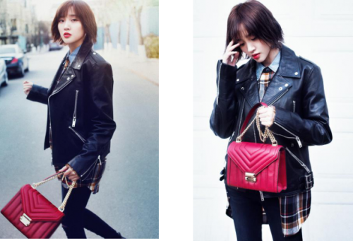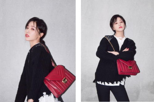 也可以将金属链条调节成长款,像阚清子那般将手袋斜跨在胸前或是单肩背,以不同搭配方式随意切换气场。Whitney绯红色手袋以一抹红色点亮阚清子整体造型,展现独特的个人气质。