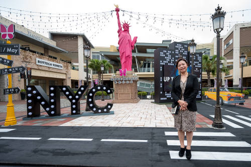 GLORIA OUTLETS华泰名品城 犹如一扇任意门,穿梭园区便能尽情享受无国界购物乐趣!图为华泰名品城总经理 梁曙凡与园区一期纽约主题装置合影。From:华泰名品城
