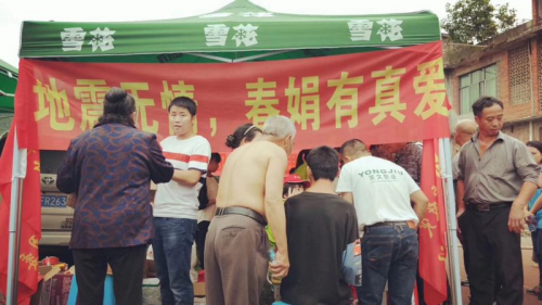在地震发生后的12小时,知名日化企业成都蓝风集团便在第一时间将首批紧急救灾物资送抵灾区。灾后长宁地区闷热多雨,集中安置点敞篷内蚊虫较多。蓝风集团在震中双河镇设立了免费的花露水发放点,为灾民提供了数十箱的春娟花露水。工作人员还亲手将一瓶瓶花露水送到救援官兵、应急抢险人员和行动不便的百姓手中。