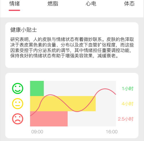 当然,有了心电图,就可以像开头说的那样,通过HRV分析来监控情绪的变化。对于爱美的女性来说,这个功能尤为重要。保持每天的好心情可以有效影响内分泌系统,从而让皮肤保持光泽。