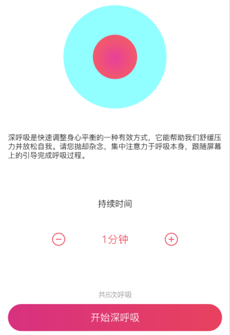 遇到心情不好的时候怎么办呢?这款产品还有一个辅助呼吸调整心态的功能。跟着提示来一组深呼吸,可以快速让心情平复下来。