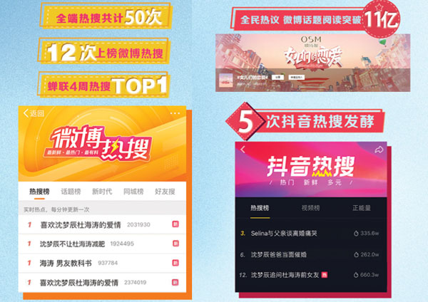 50余年的发展历程中,欧诗漫始终致力于帮助女性挖掘自身的自信与美丽,面对生活、面对爱情都能保持最美的自己。《女儿们的恋爱》明确定位女性观众群体,恋爱是节目核心话题,节目中四位女儿们所表现出的独立健康的恋爱态度,代表着当代独立女性的情感价值观,也正是欧诗漫品牌所倡导的女性精神。牵手此类充满“女性恋爱正能量” 的IP,迅速为欧诗漫品牌赋能,成功将“透光白亮出来”转化为品牌特有属性。
