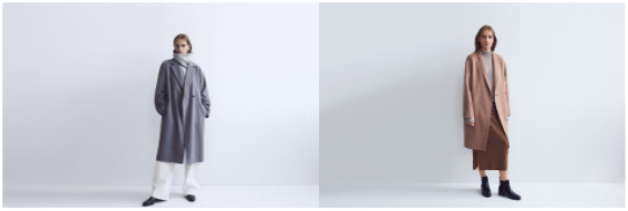 女装双面呢连帽大衣、女装双面呢茧形大衣:采用柔软呢面料,舒适有质感;内里与外层使用双面呢,造型更加丰富;简约利落的中长款剪裁,修饰身形,更显女性优雅。