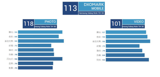 三星Galaxy Note10系列强悍的水平拍摄能力也获得了权威测试机构DxOMark的认证,以视频拍摄101分,总分113分在榜单上位列第一,展现了全能旗舰新机皇的形象。