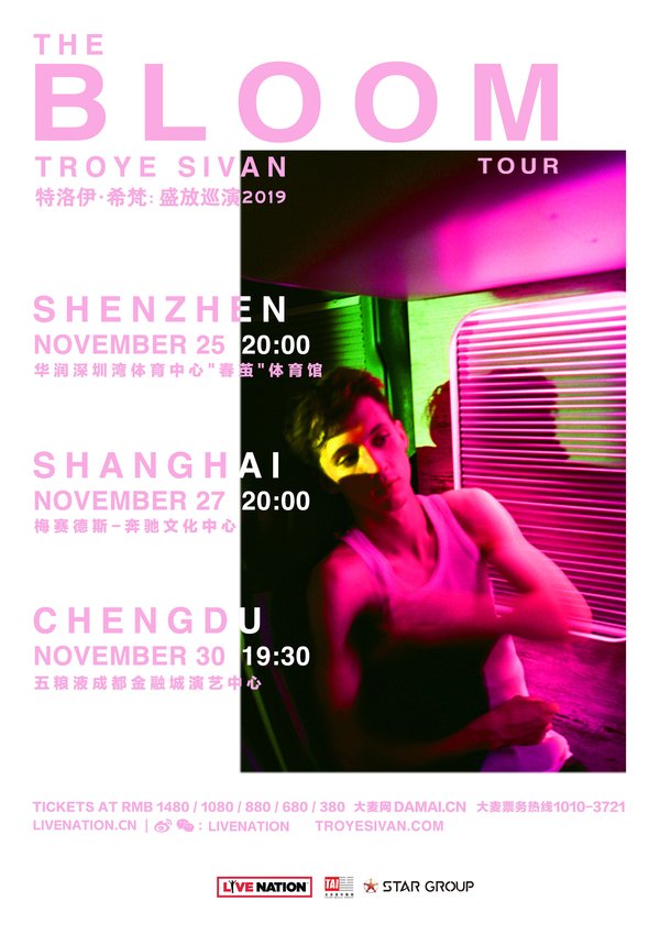Live Nation今日宣布,澳洲流行才子Troye Sivan即将重磅回归中国,携第二张个人专辑《Bloom》带来The Bloom Tour巡演,并将于11月25日深圳,11月27日上海和11月30日成都精彩开唱。