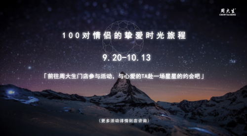 在抖音、微博爆火的周大生“挚爱时光 · 耀你星动”系列,不仅是情侣们坚贞感情的见证,更是通向挚爱时光旅程的门票,想要成为百对情侣团中的一员,在浪漫草地上,让璀璨星光的见证为你们的感情刻下名为永恒的痕迹。那9月20日-10月13日,就赶快前往周大生门店参与这一次挚爱时光旅程的活动吧。
