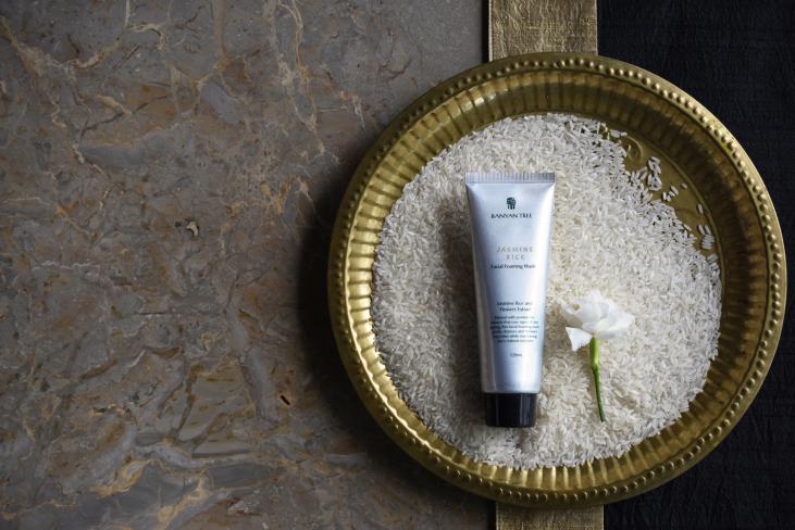 Banyan Tree Essentials(悦榕)的取材处处体现亚洲智慧。将传统的亚洲材料运用到天然草本配方当中。茉莉香米系列采用泰国当地农作物制成,融合具有抗氧化作用的米糠油,与再生功效闻名的舒缓茉莉花水,激发细胞再生,达到抵御初老症状。