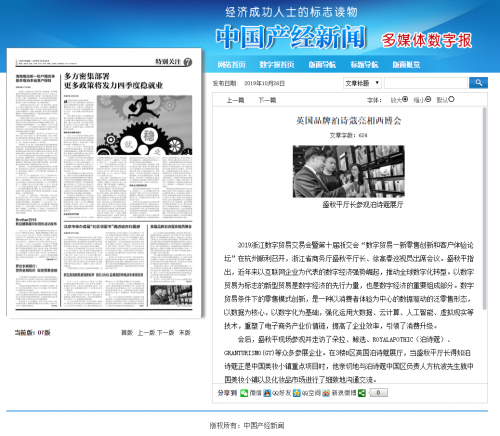 导语:10月26号出版的《中国产经新闻报》,在特别关注版报道了“英国品牌泊诗蔻亮相西博会”浙江省商务厅厅长盛秋平一行参观泊诗蔻西博会展厅的新闻,以下为全文: