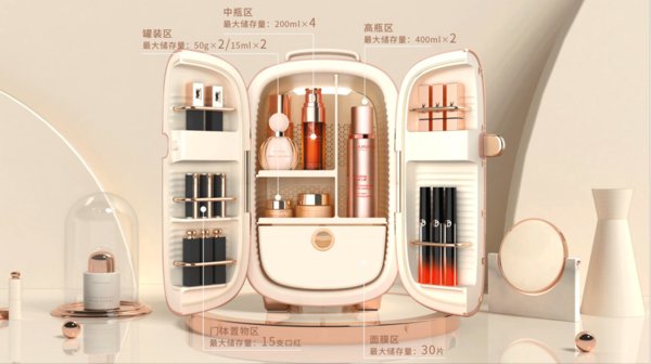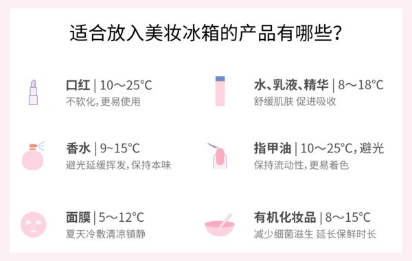 每种化妆品都有偏好的储存温度,10~15摄氏度这个温度区间能满足绝大多数化妆品的储存要求。传统小冰箱的冷藏温度设定为1~8摄氏度,更适合食品的保鲜储存,但是对化妆品来说却是过低了。