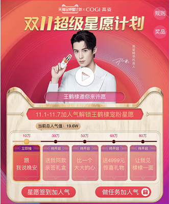 每日打卡心愿热线互动,为王鹤棣加人气,11.1-11.7期间每天都有机会赢高姿百万宠粉福利——海量明星周边、见面会门票还有承包小可爱全年精华用量(高姿太空舱精华12份!)