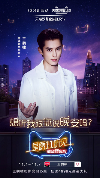 高姿的心愿热线专线也开通啦,王鹤棣将在线帮你实现心愿。在这个双11,跟高姿一起宠你!