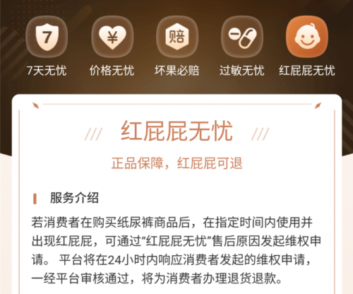 以红屁屁无忧为例,消费者在贝贝网购买含有“红屁屁无忧”服务标识的商品后,在指定时间内使用并出现红屁屁,即可通过“红屁屁无忧”售后原因发起维权申请。平台会在24小时内响应消费者发起的维权申请,若情况属实将迅速为消费者办理退货退款。
