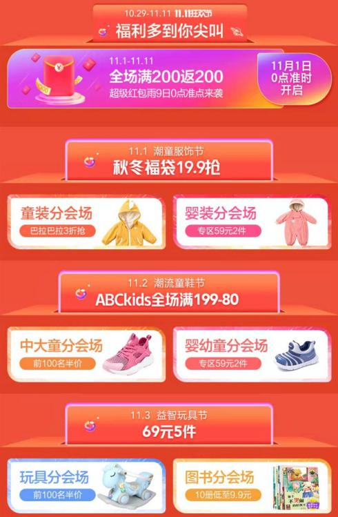 11月1日至11日则是贝贝双11正式活动期。预热期获得的满减优惠券和无门槛砍价券不仅可以在活动期内使用,还可以和商家店铺券叠加使用。同时,在正式活动期,还有单笔订单消费满200元返200元组合券;54个商品1元秒杀;限时抢红包;整点抢免单,等福利活动。