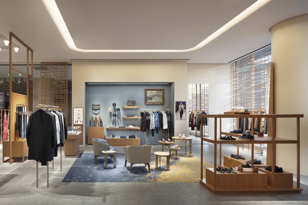 步入店内,色彩斑斓的男性与女性丝织品映入眼帘,与后方皮具区域相映成趣。店内右侧,家居与香氛世界将时尚珠宝环绕其中;店内左侧,分别以灰蓝色与浅黄色呈现主色调的男性世界与女性世界分列在旁;两大区域之间更有特别手工制作的竹木马赛克墙,其中陈列着珠宝与腕表。对比鲜明的马赛克图案地板与浅灰色调天然大理石划分各大产品部类,并由三块中央地毯延伸至各区。
