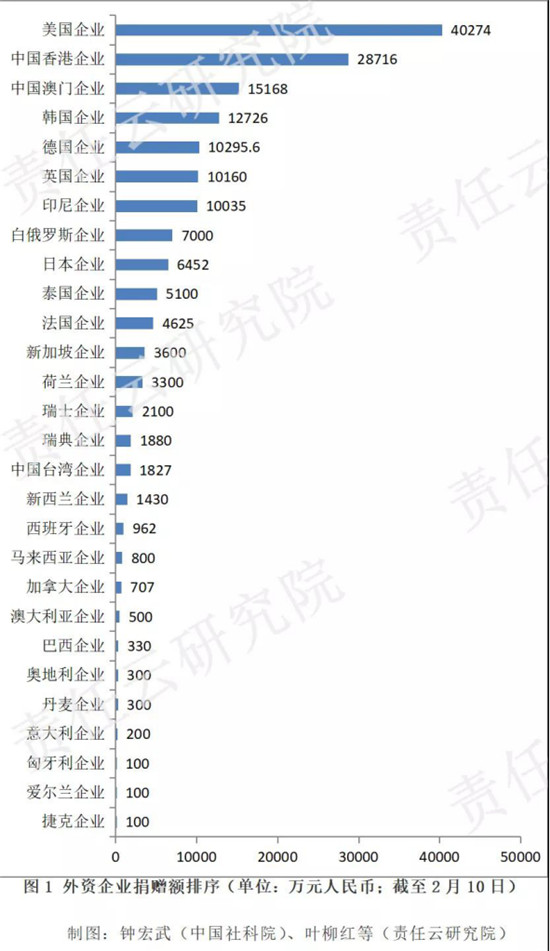 婕斯环球只是外企捐助的一个缩影。据中国社科院钟宏武博士、责任云研究院执行院长叶柳红通过全网搜索统计数据显示,截止2月10日,共计297家外资企业累计捐赠了16.91亿元人民币,占所有企业捐赠总额的7.2%。其中,印尼金光集团、白俄罗斯WG、美国CITADEL、英国利洁时集团、泰国正大集团捐款额度都达5000万以上。