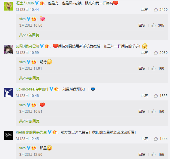 刘昊然代言的汤达人、剑网3、瑞幸咖啡和科颜氏等品牌,纷纷在vivo微博下留言,对自家代言人格外称赞。