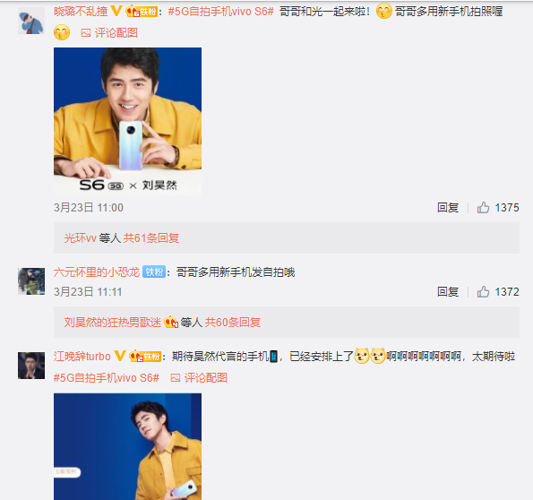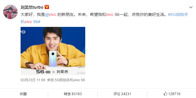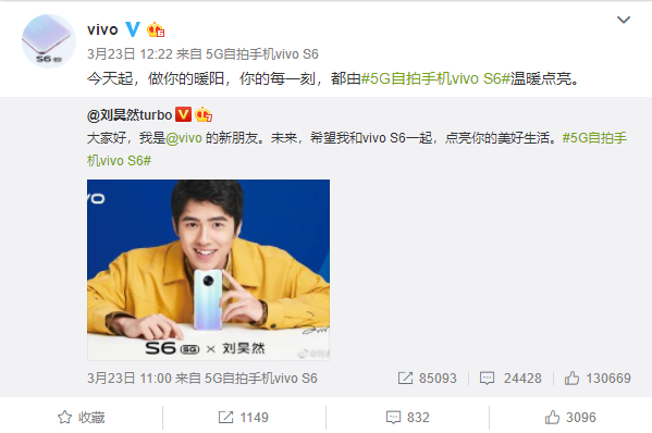 刘昊然也发微博称:“大家好,我是@vivo的新朋友。未来,希望我和vivo S6一起,点亮你的美好生活#5G自拍手机vivo S6#”。