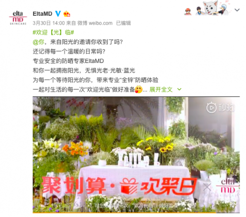 2020年3月,在疫情逐渐缓和的大背景下,跨境电商平台热销的洁面品牌TOP1、NO.1美国皮肤科权威推荐的专业防晒品牌EltaMD携手代言人许凯,联合聚划算欢聚日,推出首个以聚划算平台为载体的公益主题品牌推广活动,为所有消费者的重返阳光做好安全专业的防晒准备。
