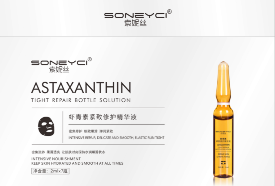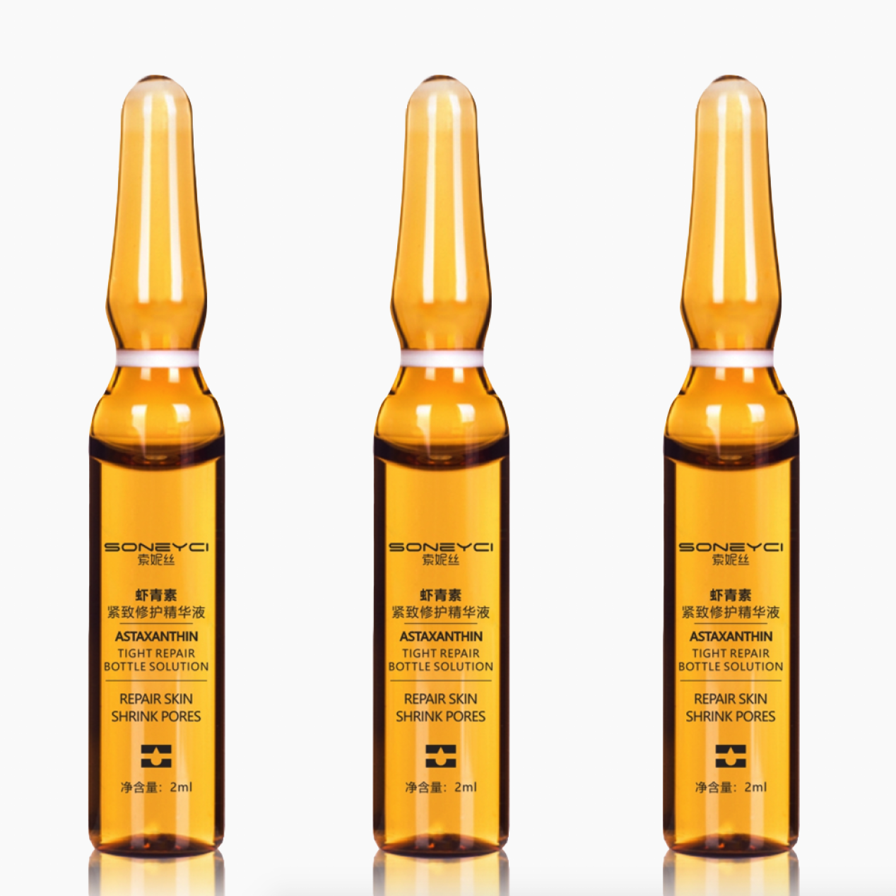3.索妮丝虾青素精华 #虾青素紧致修护精华液 2ml x 7瓶 这款是几款里面唯一不是医用的,用途比较广,价格也不贵。而且用密封小瓶分装的包装方式,能有效防止精华液被空气二次污染。使用的时候只需将开瓶器或者滴管套套在安瓶顶部,轻轻按挤压,使安瓶折断,再将滴管套在安瓶上,挤出安瓶原液,均匀涂抹于面部、颈部肌肤,轻轻按摩至完全吸收即可。我一般打开就是用一天,早晚各一次,这个是黄色的液体,也是很好吸收不会粘腻,我个人觉得这个是修复效果最好的。