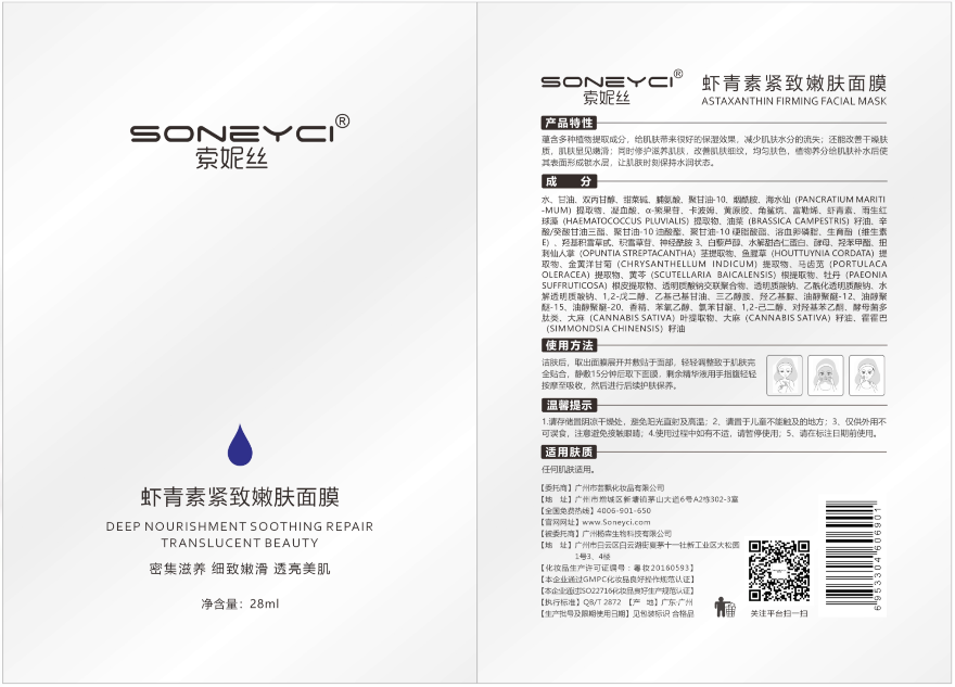 除了虾青素紧致修护精华液外,索妮丝还推出了虾青素紧致嫩肤面膜,蕴含多种植物提取成分,能给肌肤带来很好的保湿效果,改善干燥肤质的同时修护滋养肌肤,均匀肤色,虾青素精华液和面膜搭配使用,抗氧化效果更好!