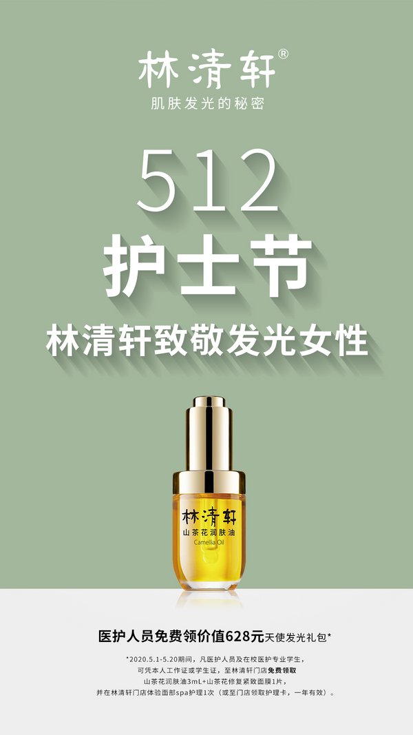 为此,林清轩不断努力,为女性的肌肤健康保驾护航,从疫情爆发之初,向前线医护人员捐赠138万元的山茶花润肤油,到发布公益广告,呼吁全民在家防疫时关注肌肤健康,再到护士节,献礼白衣天使打造美丽发光肌,林清轩满怀对女性温柔力量的敬意,让平凡而伟大的白衣天使们美到发光。