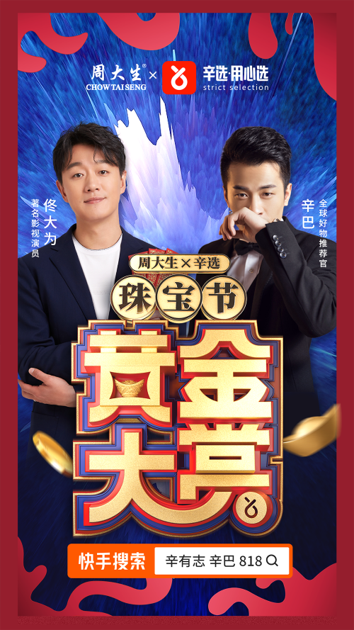 6月21日父亲节,快手“带货一哥”辛巴辛有志亮相周大生总部,开设“辛选珠宝节”专场,直播带货累计突破4.8亿销售额,轰动全国。