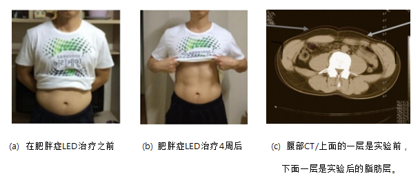 在韩国檀国大学医院的机构审查委员会批准下进行的实验中,使用Lumidiet瘦身仪,共4周,每周4次,每节30分钟使用近红外LED照腹部肥胖试验中,试验组比对照组腰围和体重有明显的减轻。在该临床试验中,没有引起副作用等的异常反应,因此将LED用于减少腹部脂肪的评估为安全。