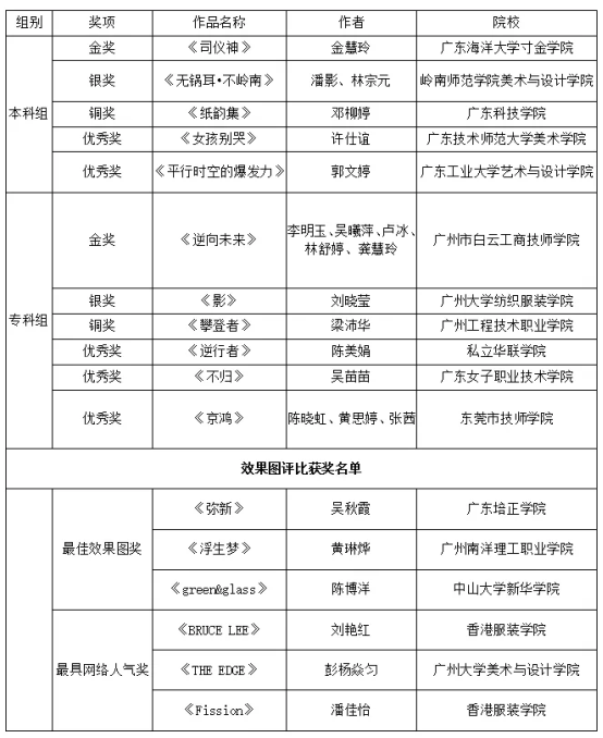 ×îÖÕ£¬À´×Թ㶫º£Ñó´óѧ´ç½ðѧԺµÄ½ð»ÛÁáÉè¼Æ×÷Æ·¡¶Ë¾ÒÇÉñ¡·¡¢¹ãÖÝÊа×ÔÆ¹¤É̼¼Ê¦Ñ§ÔºµÄÀîÃ÷Óñ¡¢ÎâêØÆ¼¡¢Â¬±ù¡¢ÁÖÊææÃ¡¢¹¨»ÛÁáÉè¼Æ×÷Æ·¡¶ÄæÏòδÀ´¡··Ö±ðÕ¶»ñ±¾¿Æ×顢ר¿Æ×éµÄ¹ð¹Ú£¬³ÉΪ±¾½ìʱװÖܹ㶫´óѧÉúÓÅÐã·þ×°Éè¼Æ´óÈü×îºóµÄÓ®¼Ò¡£