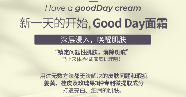 רҵµÄÑз¢¼¼ÊõºÍÓÅÐãµÄ²úÆ·¹¦Ð§ÈÃGOODDAY½ª»ÆÏµÁвúƷѸËÙ±»´óÖÚÇàíù£¬³ÉΪ»¤·ôÆ·ÐÐÒµÀïµÄÃ÷ÐDzúÆ·¡£ÔÚÈç½ñÕâ¸ö°¾Ò¹µ±·¹³ÔµÄʱ´ú£¬¼¡·ôÎÊÌâ²»¿É±ÜÃâÔ½À´Ô½¶à£¬¶øÁ³ÊÇÈ˵ĵÚÒ»ÕÅÃûƬ£¬Ò»Æ¿GOODDAY½ª»ÆÃæËª£¬Ò»ÕÅGOODDAY½ª»ÆÃæÄ¤±ãÄܰïÄãÇå³ý¼¡·ôÎÛ¹¸£¬ìî³ý¶»°ß£¬»¹Ä㾫ÖÂÃæÅÓ£¬ÈÃÄãÔÚ±ðÈËÐÄÄ¿ÖеÄÓ¡ÏóÔö·Ö²»ÉÙ£¬ÕæÐÄÖµµÃÓµÓС£