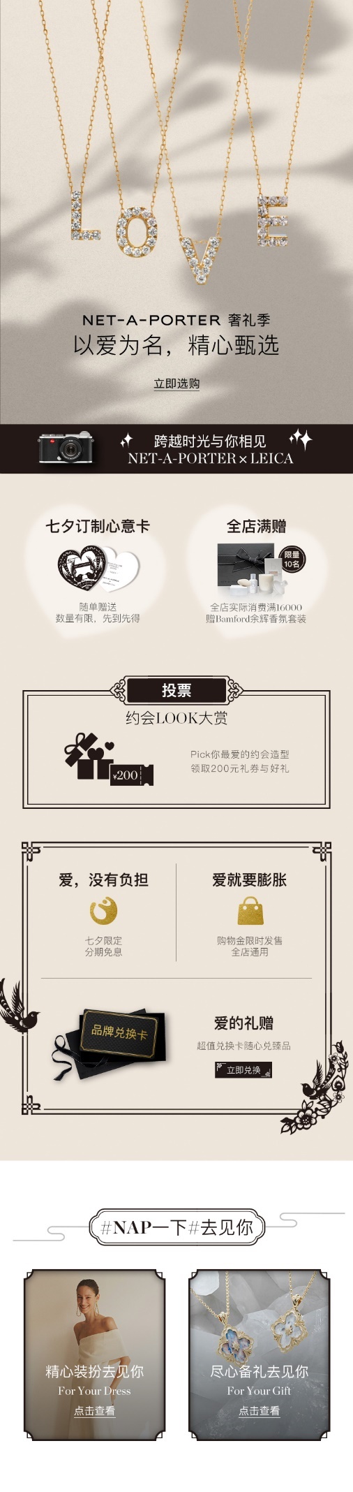 #NAP一下#去见你 七夕,是关于相会的日子,全球著名时尚奢侈品电商NET-A-PORTER认为每一次相见都是一场精心策划,或精致隆重、或出乎意料。我们见证摩登爱情中的每一次相见...