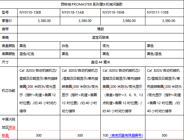 全新的西铁城PROMASTER系列潜水机械河豚款共有四款不同配色的型号,均配有橡胶表带。两款黑色表盘的型号,一款是红色(首15分钟位置)配蓝色的表圈,另一款是蓝色(首15分钟位置)配黑色的表圈,颜色的组合时尚又富有个性。另外,还推出了以黑色表圈配白色表盘的型号,这是潜水表中很独特的配色。更值得一提的是,在这次的新品中,表后盖刻有限量编号的限量款夜光表盘也强势回归。