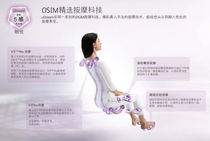 在「触觉」上,用 OSIM精选按摩程序,专利V手™ Pro科技+4手Pro按摩科技带来从头到脚的放松享受。