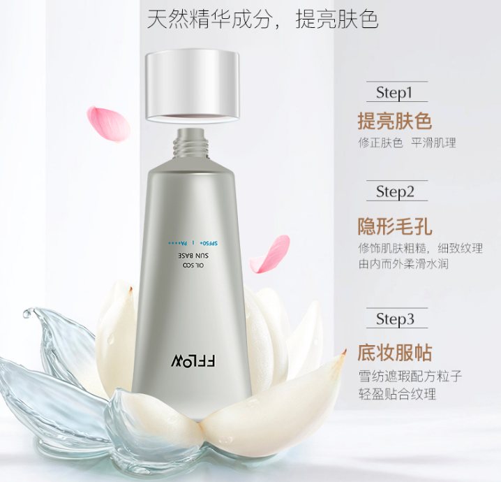 FFLOW精油水防晒隔离霜涂抹在脸上即可感受到沁润水感,加上特有成分精油水及清脂复合因子,不仅能抑制皮脂过度分泌,保持妆容持久清新,还能由内而外淡化色素,让肌肤焕发白皙光泽。