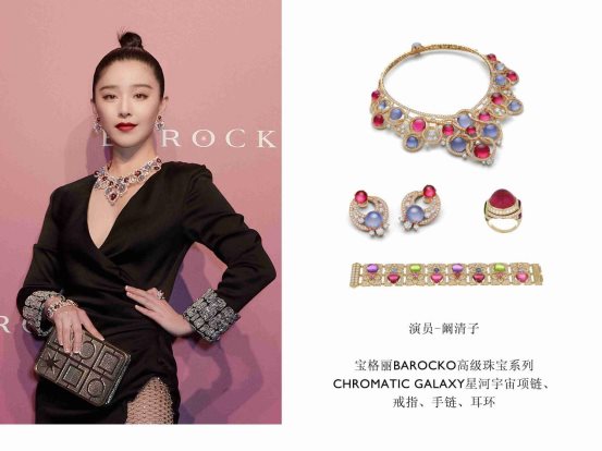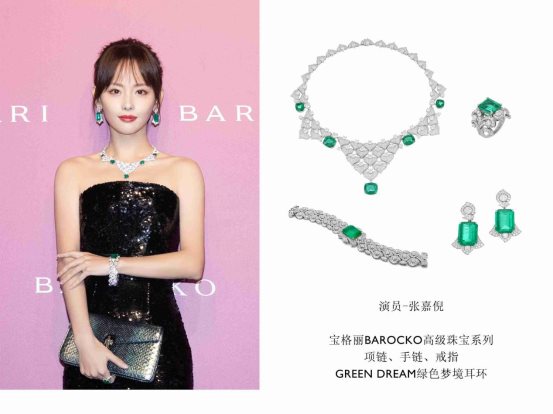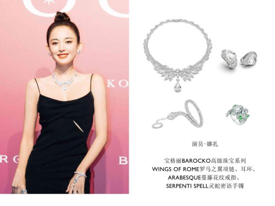 娜扎佩戴宝格丽Barocko高级珠宝系列Wings of Rome罗马之翼项链、耳环、Arabesque蔓藤花纹戒指、Serpenti Spell灵蛇密语手镯及Serpenti Cabochon系列迷你包,在钻石光芒的映照下闪烁全场。唐艺昕佩戴宝格丽Barocko高级珠宝系列Colour Wonder色彩奇观项链、戒指、耳环、Serpenti系列高级珠宝腕表及BVLGARI晚宴包,聚光灯下甜美动人。张嘉倪佩戴宝格丽Barocko高级珠宝系列项链、手链、戒指、Green Dream绿色梦境耳环及Serpenti Forever肩包,散发公主般的优雅气韵。阚清子佩戴宝格丽Barocko高级珠宝系列Chromatic Galaxy星河宇宙项链、手链、耳环、戒指及黑色和金色亮面蜥蜴皮盒式手拿包,于缤纷夺目的色彩衬托下耀目十足。