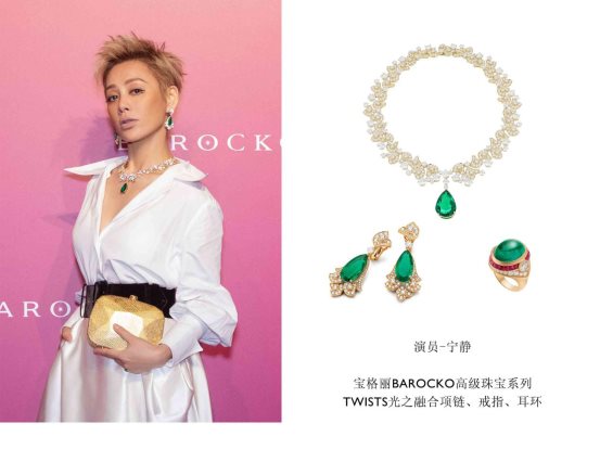 宁静佩戴宝格丽Barocko高级珠宝系列Twists光之融合项链、戒指、耳环及Serpenti Brilliant Cut手拿包,举手投足间释放强大气场。