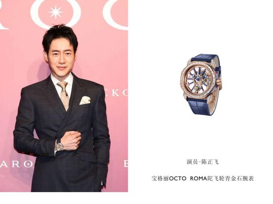 陈正飞佩戴宝格丽Octo Roma陀飞轮青金石腕表,酷雅从容。