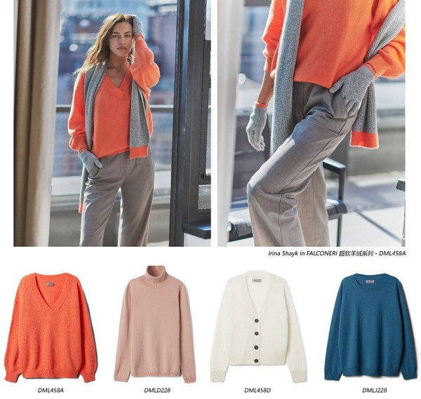 超轻羊绒丝般柔软的触感与最佳的透气性适合贴身穿着,带来悦人轻柔感受。羊绒选取自蒙古和内蒙古的黑尔库斯(Hircus)山羊,其特殊的制作工艺使其更加轻薄并具有良好的保温性,无缝构造的至臻工艺使其呈现良好版型。超模伊莉娜·莎伊克(Irina Shayk)在FALCONERI超轻羊绒系列大片中身着灰色的圆领套衫展现高雅气质。多种颜色满足秋冬的搭配所需,是四季可穿的衣橱常青单品。