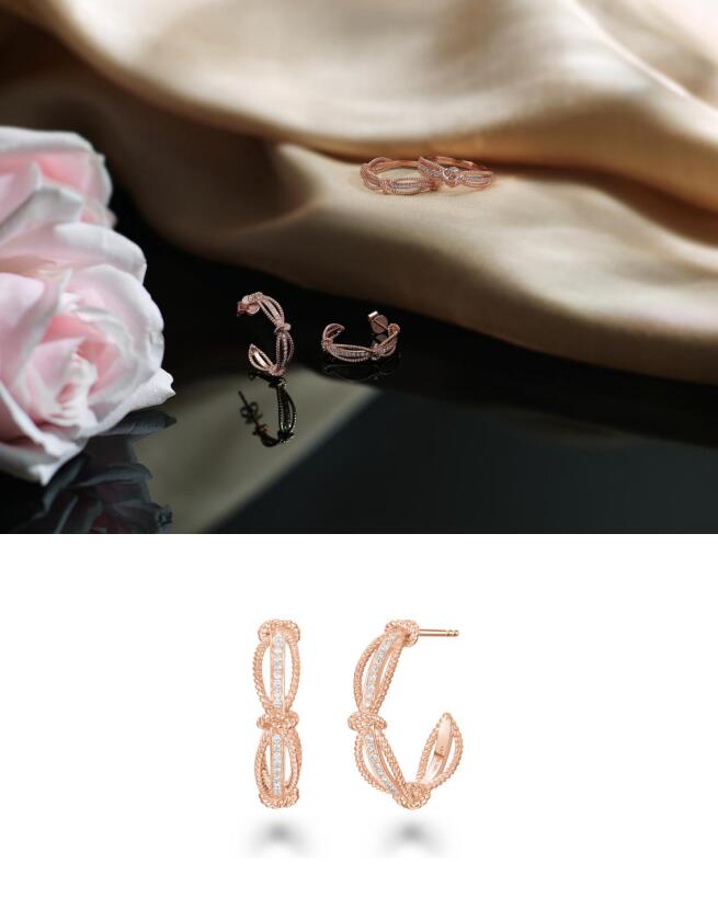 不论手镯、戒指还是耳饰,The Knot结系列「纪念日」作品都有标志性的结构。立体螺旋状的金属绳索,在圆环上缠绕、打结,形成松紧有度、纹路动感的形态,远看如花朵般微微绽放。