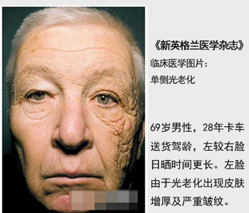 下图是一位拥有25年车龄的货车司机,25年来,靠近车窗一侧的脸经常受到紫外线照射,出现了严重的皮肤皱纹,于是左右脸的反差下就形成了如此恐怖的阴阳脸,紫外线对皮肤的伤害由此可见一斑。