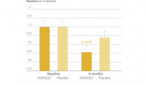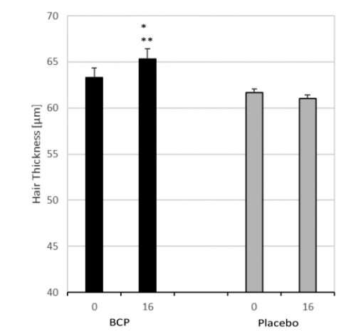 实验选择了44名不同年龄阶段的健康女性每天服用特异生物活性胶原蛋白肽(K Klarity SG胶原蛋白的核心成分)。16周后,与对照组相比服用胶原蛋白的人群毛囊细胞增殖率增加了31%,头发厚度显著增加1.93±0.42,而对照组(安慰剂)的头发厚度则略有下降-0.99±0.40。