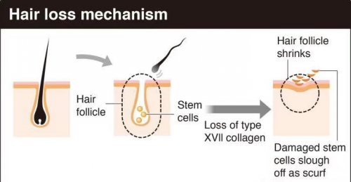 75%至80%的皮肤是由胶原蛋白组成的,脸上的皮肤会随着年纪增长逐渐失去胶原蛋白,头皮上的皮肤同样会这样。事实上,胶原蛋白和毛囊都存在于皮肤的同一层——真皮层。当胶原蛋白生成速度减缓,毛囊的强度也会削减。