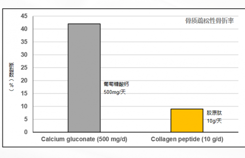 在实际效果上,经过3年的研究,42%的受试者在日常服用葡萄糖酸钙治疗后,仍然会出现新的骨折,而服用胶原蛋白肽的受试者只有9%会出现骨质疏松性骨折,可以说明口服胶原蛋白肽能够增强人体的成骨力并降低骨折率。