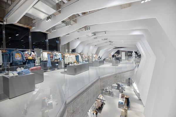 UR大上海时代广场店以“都市剧院”作为空间设计的灵感来源,从外部构造、色彩搭配、内部装饰、陈列展示等各方面诠释这一概念。店铺正面紧邻繁华街道,侧面则面向幽静小路,从两种不同角度展现出创作者的设计巧思:站在店铺正面时,呈现眼前的是店内错落有致的多层几何结构,犹如层层重叠的剧院帘幕;而从侧面看到的景象则仿佛帘幕之下的剧院后台,令人充满无限遐想。更特别的是,店铺首层以“室内街道”为设计概念,与店外川流不息的淮海路恰好平行,顾客在陈列服饰之间穿行时将获得“动静结合”的沉浸式体验。