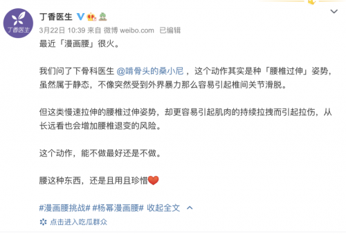 权威医学博主发布微博称,“这个动作其实是种’腰椎过伸’姿势……容易引起肌肉的持续拉拽而引起拉伤,从长远看也会增加腰椎退变的风险。能不做最好还是不做。腰这种东西,还是且用且珍惜。”
