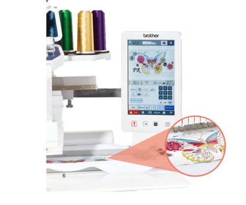 Brother新款商用绣花机PR1055X拥有10.1英寸的超大LCD显示屏,分辨率再次升级,令绣花样品显得更为栩栩如生、清晰可辨。消费者可以通过轻触图标和菜单进行操作,轻松地在屏幕上直接进行绣花编辑,包括“输入”、“排列”、“组合”、“取消组合”、“线色排序”、“跳过此线色”等。